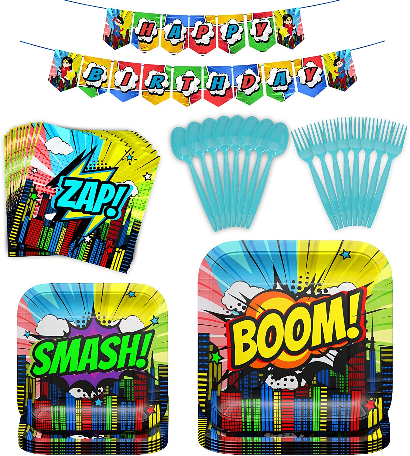 🦸🏻 ALL IN ONE PACK - Contains (20) 9" Dinner Plates - (20) 9" Dessert Plates - (20) Lunch Napkins - (1) Happy Birthday Banner - (24) Sky Blue Spoons - (24) Sky Blue Forks. You can throw a party for 20 guests without having to worry about running out of supplies!