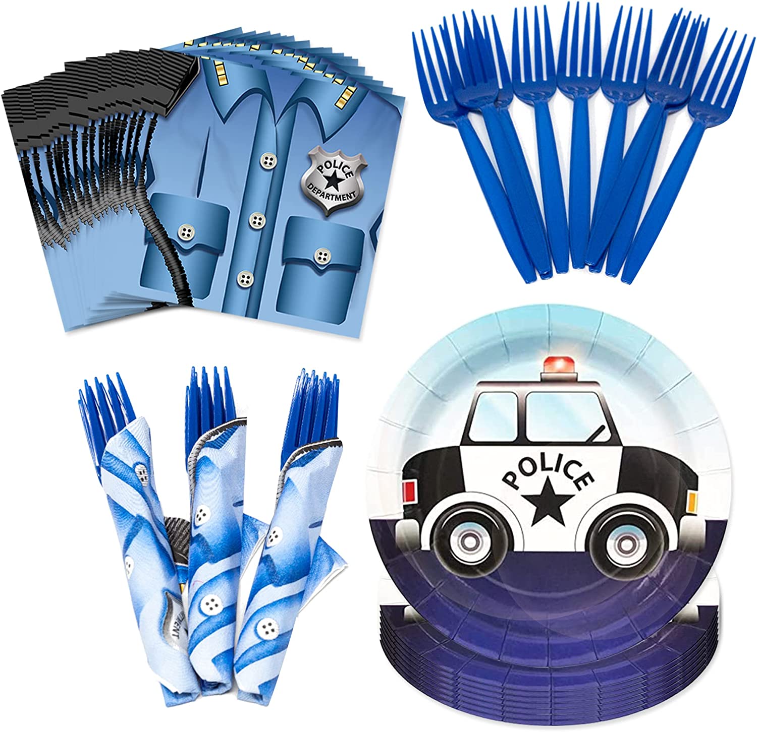 - [EVERYTHING YOU NEED] Add these fun party supplies to your party tables! Police Value Party Supplies Packs include 16 7-inch paper dessert plates, 20 paper lunch napkins and plastic forks. NOTE: FORK COLOR MAY VARY!