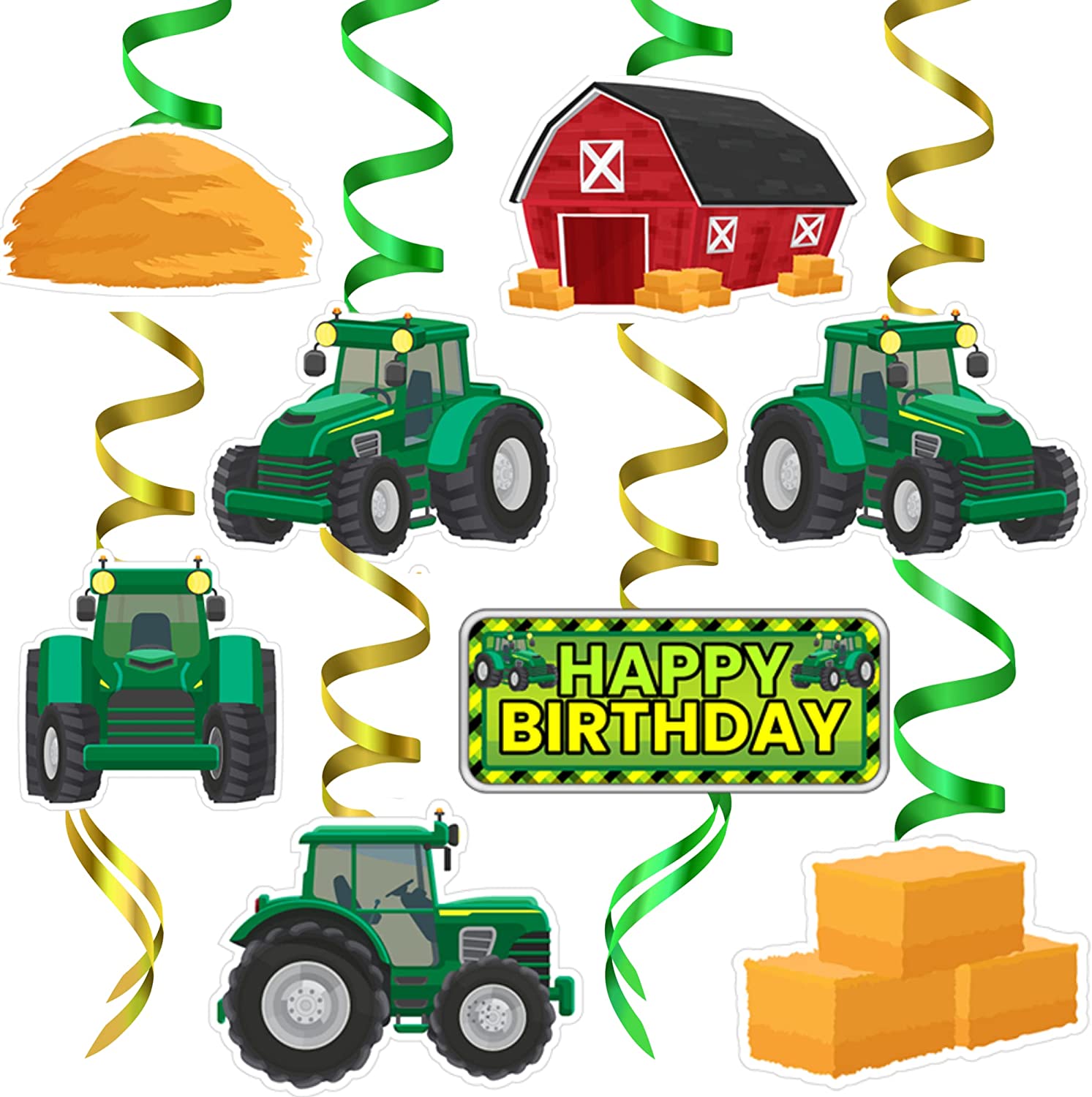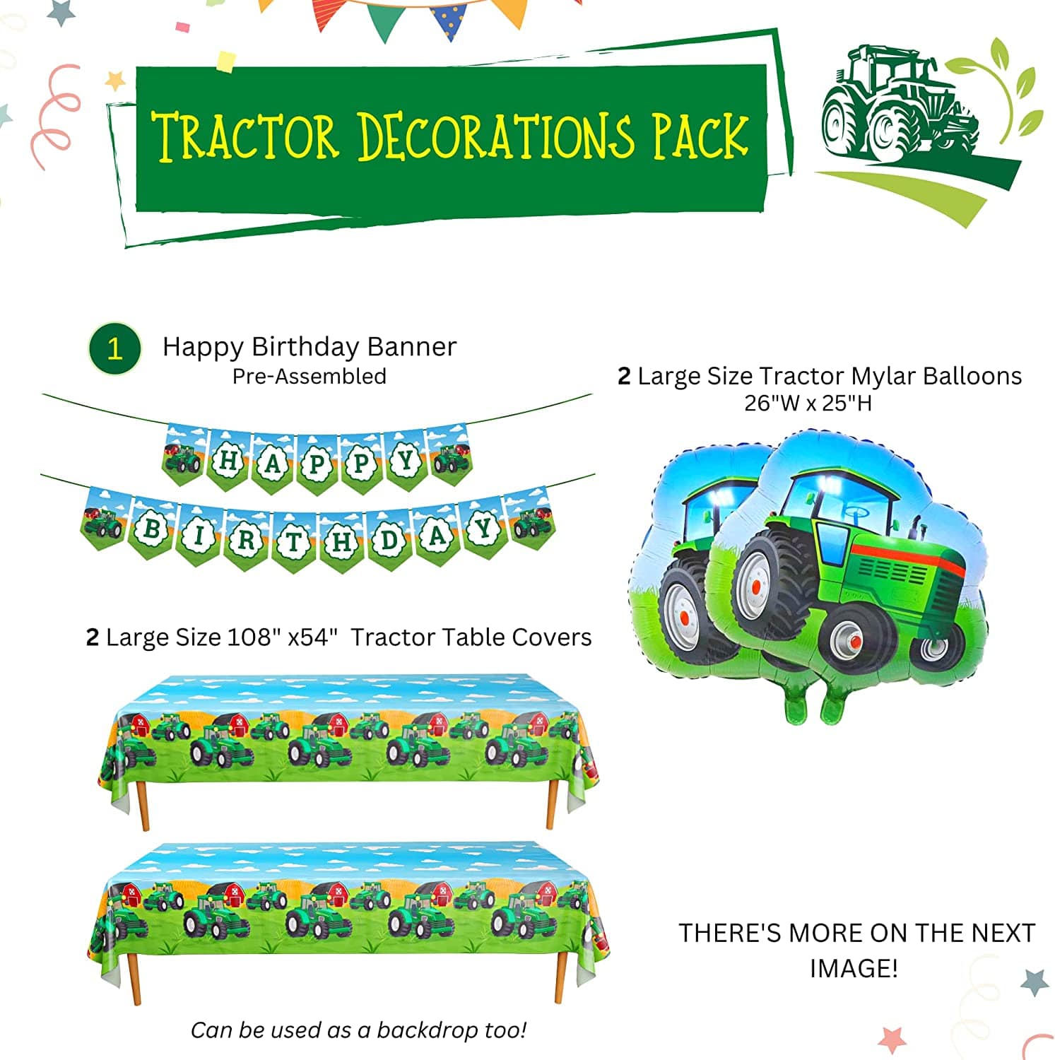π Contains (2) Large Tractor Mylar Balloons - (10) Green Balloons - (10) White Balloons - (2) Large Tractor Table Covers - (1) Happy Birthday Banner - (8) Tractor Double Printed Cutouts - (4) Green Single Swirls - (4) Yellow Single Swirls - (3) Green Double Swirls - (3) Yellow Double Swirls - (40) Glue Dots. All these in ONE Pack!